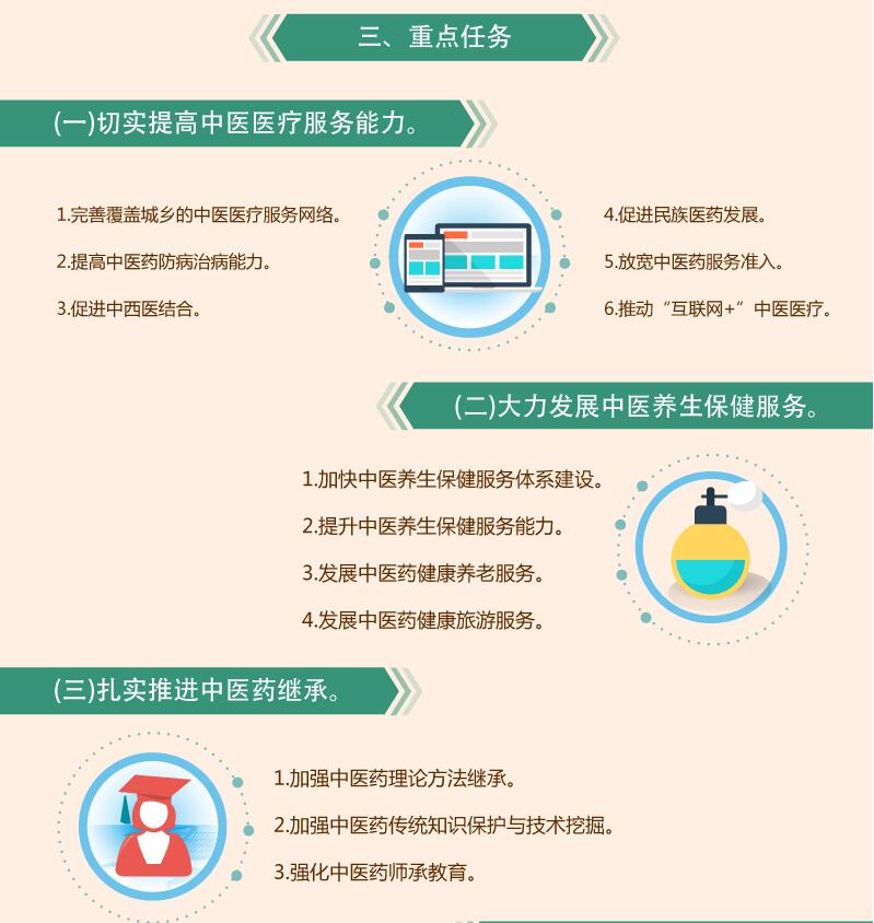 《纲要》提出,要坚持中西医并重,落实中医药与西医药的平等地位,遵循中医药发展规律,以推进继承创新为主题,以提高中医药发展水平为中心,以完善符合中医药特点的管理体制和政策机制为重点,以增进和维护人民群众健康为目标,拓展中医药服务领域,促进中西医结合,统筹推进中医药事业振兴发展。到2020年,实现人人基本享有中医药服务,中医药产业成为国民经济重要支柱之一;到2030年,中医药服务领域实现全覆盖,中医药健康服务能力显著增强,对经济社会发展作出更大贡献。